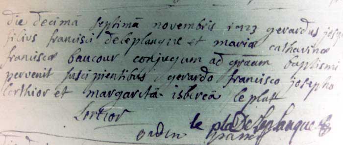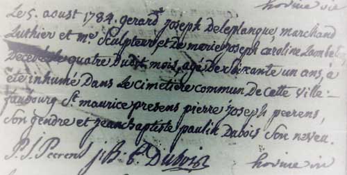 Gérard Joseph Deleplanque vit le jour le 17 novembre 1723 à Lille paroisse Etienne, fils de François, marchand grossier et musicien, et de Marie Catherine françoise Beaucourt. Ses ancêtres originaires de Roubaix arrivèrent sur Lille Saint Etienne à la fin du XVIIème siècle et c'est là que fut baptisé son père en 1698.